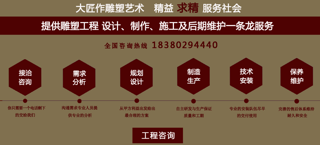 成都大匠作雕塑有限公司,是經(jīng)成都工商局審定注冊的正規(guī)專業(yè)雕塑制作及工程安裝服務(wù)機(jī)構(gòu),是由一群年輕富有朝氣的年輕人創(chuàng)辦,發(fā)軔于四川省成都市龍泉驛區(qū)。它是一家******于創(chuàng)作、制作和銷售為一體的公司。大匠作擁有多年從事公共藝術(shù)的專業(yè)人員和雕塑制作人組成的核心團(tuán)隊,為您提供專業(yè)、具創(chuàng)新的設(shè)計及制作服務(wù)。公司成立以來,秉承“******服務(wù)、誠信為本”的宗旨,以客戶需求為目標(biāo)導(dǎo)向,不斷學(xué)習(xí),進(jìn)取,優(yōu)化和提高服務(wù)質(zhì)量,公司向您******——“您的滿意***是我們的信譽(yù)”,我們將以飽滿的熱情和******的服務(wù)贏得您的贊譽(yù)和支持。 愛心,細(xì)心,耐心,責(zé)任心是我們的要求,盡心盡職,為您打造出創(chuàng)新、專業(yè)、******的設(shè)計方案,我們堅信先做人、后做事,用心對待客戶,實行透明收費(fèi),人性化服務(wù),本著對客戶負(fù)責(zé),對客戶負(fù)責(zé),更是對自己發(fā)展負(fù)責(zé)的態(tài)度,爭取做到讓每位客戶滿意
